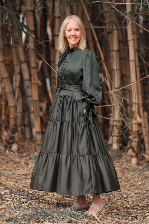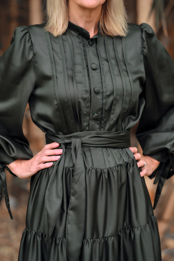 Crafted from our custom dyed Tencel Satin Fabric, the bodice of this luxury dress is adorned with covered buttons and features intricate pleated details that are complimented by a relaxed, gorgeous three tiered maxi silhouette that dances just above the ankle. The flattering bishop sleeves are complete with our signature wrist ties to give you the perfect dress that will take you from day to night all year round with multiple styling options!