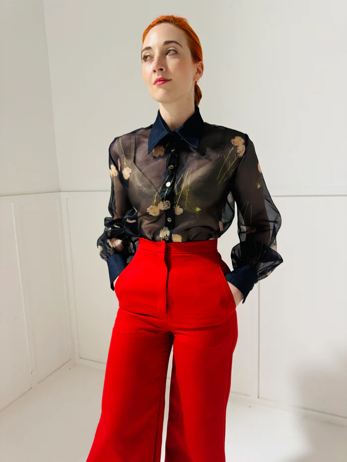 This Anthony in navy floral print is made in a beautiful silk organza . Classic collar, similar to Geo shirt, with the back pleat and with classic cuffs, slight bell sleeve.
