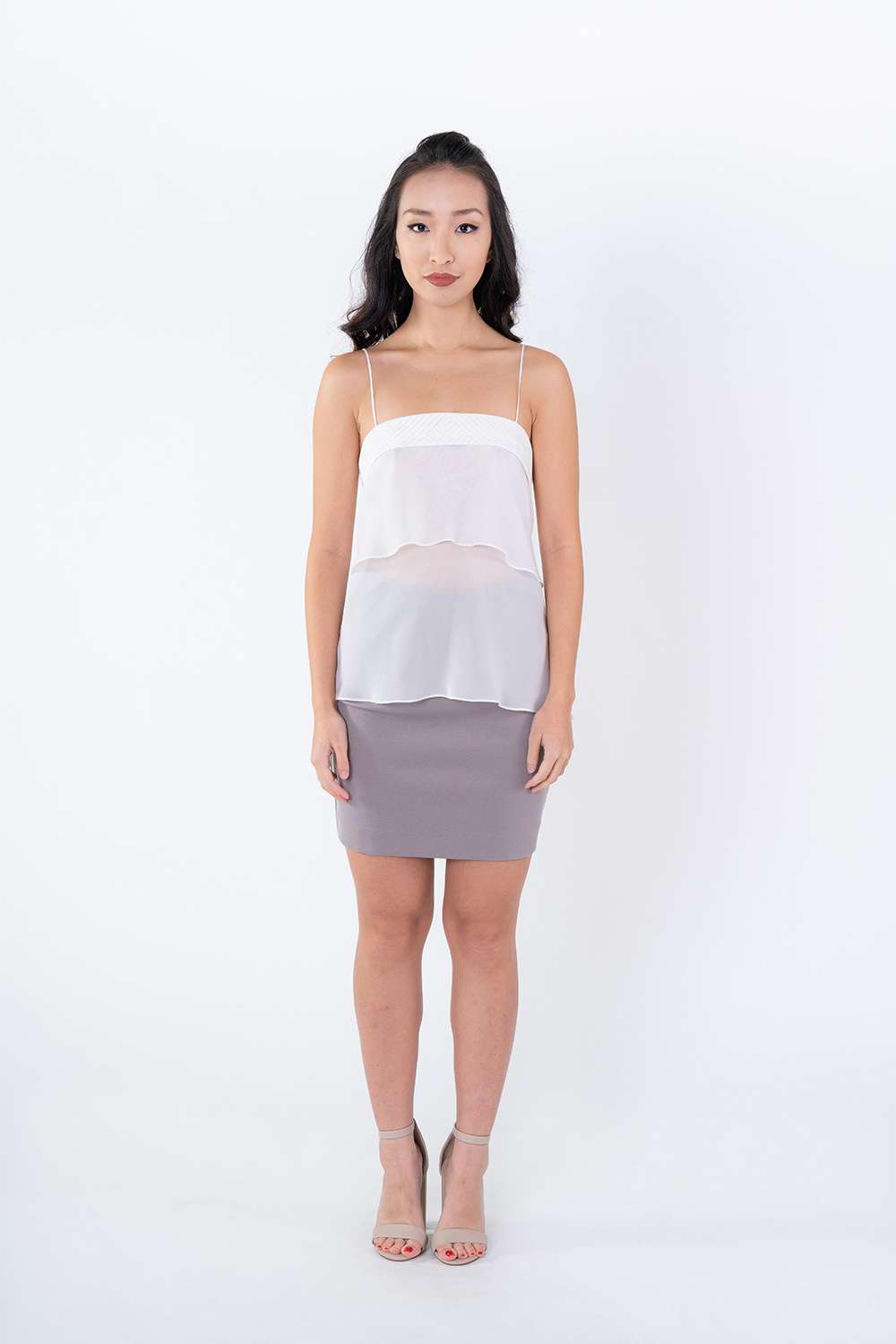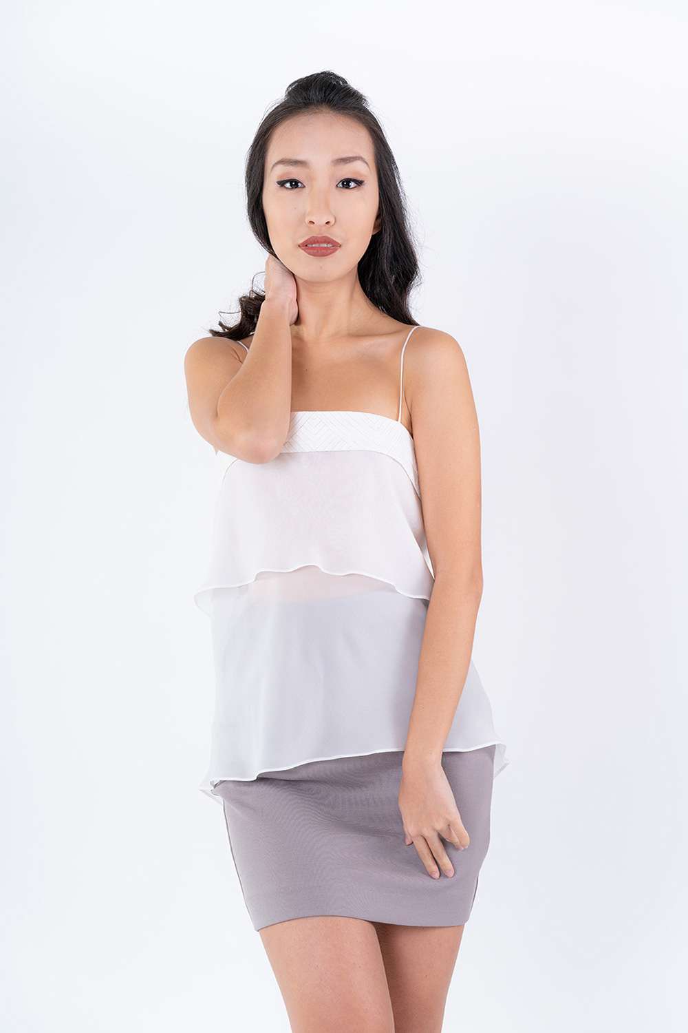 The elegant Arabel Top is a double textured top with discrete spaghetti straps and a double layer of Silk Georgette. A standout feature is the hem faking lower at the back. It has a flattering line on the back with a generous silk tie closure.