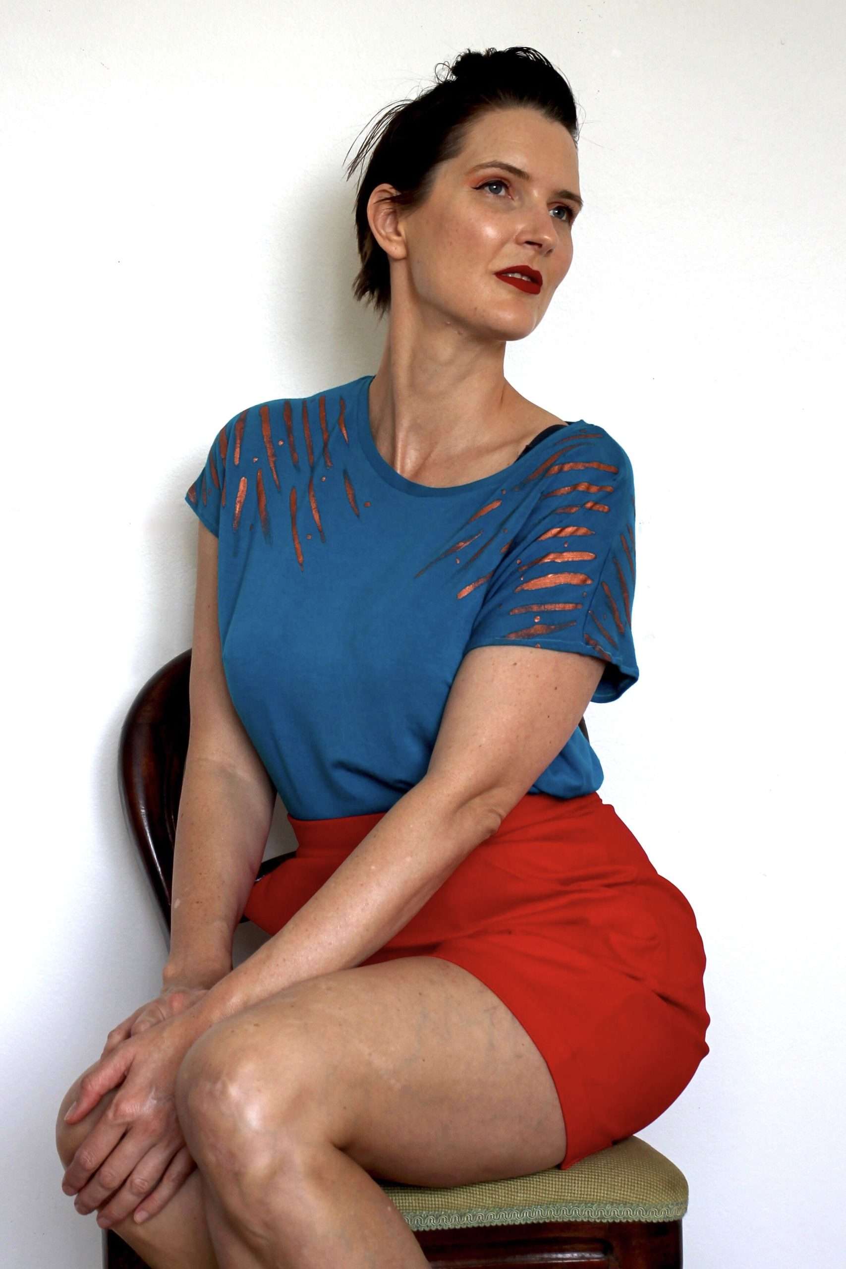 This women’s tee has been hand painted individually so each one is slightly different to the next. The bright jade blue colour contrasts the metallic rose gold painting beautifully. If you are looking for something unique and individual with a little bit of sophistication, look no further! Hand made in Sydney, Australia by your local ethical fashion designer.