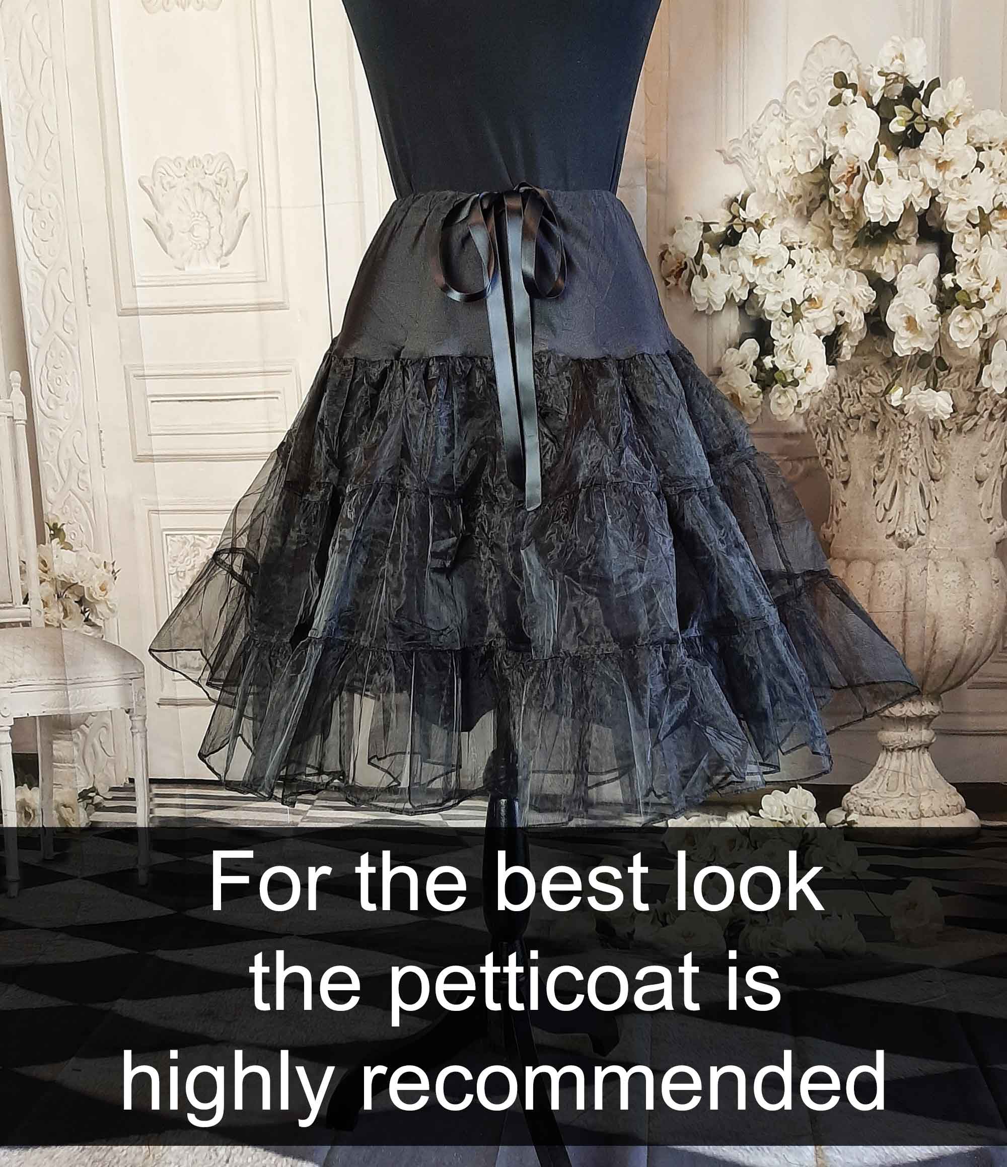 The skirt measures approximately 57 cms (22 inches) in length and looks best with the petticoat underneath to puff it out. Photographs show the skirt with a petticoat underneath.Â