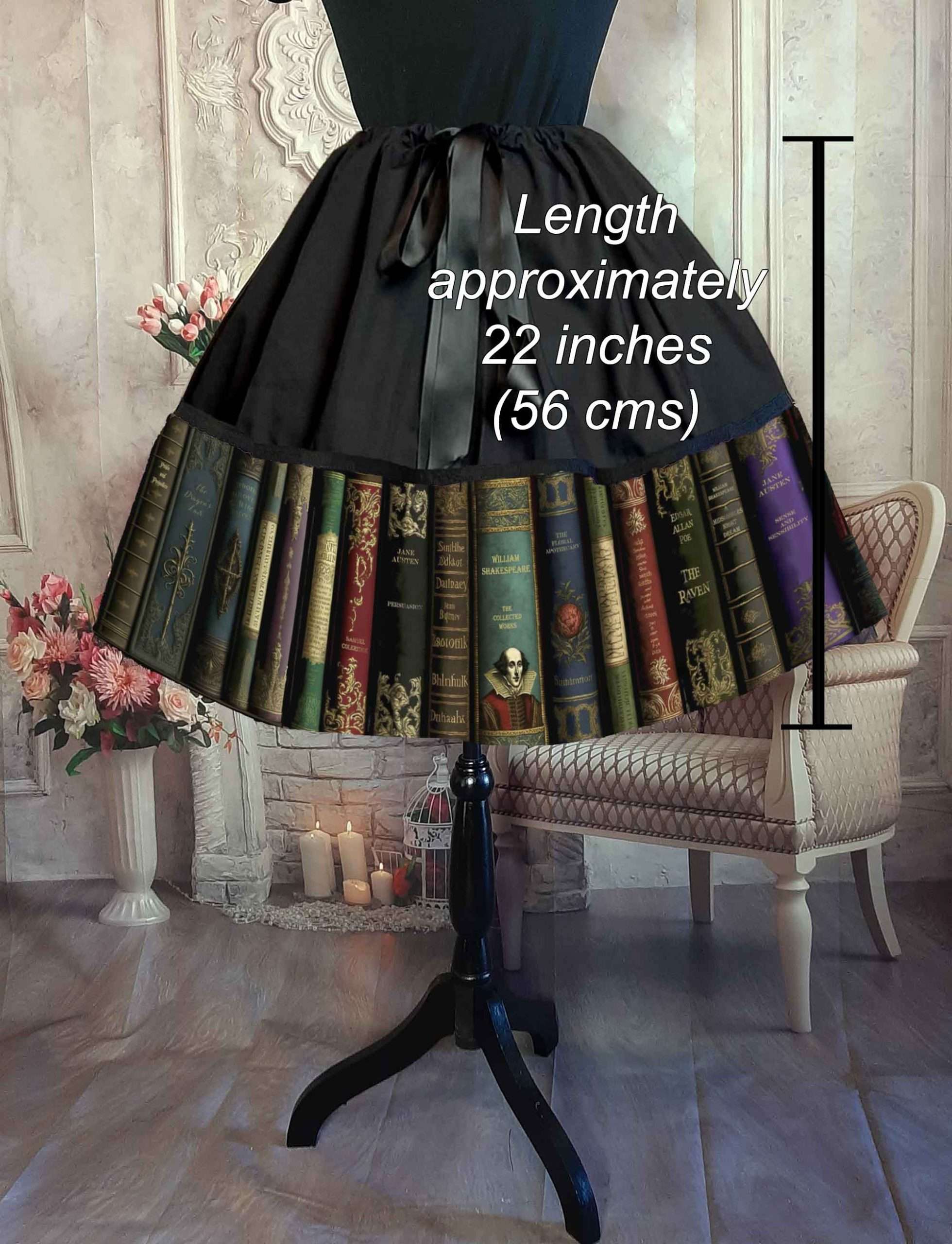 Books, books and more books. When you are needing that perfect party skirt for a literary event, maybe a visit to an Art Gallery or as part of a Dark Academia ensemble, this skirt will certainly be a conversation starter. You’ll find books by Shakespeare, Dickens, Jane Austen and Edgar Allan Poe plus mystery titles for additional fun.Â