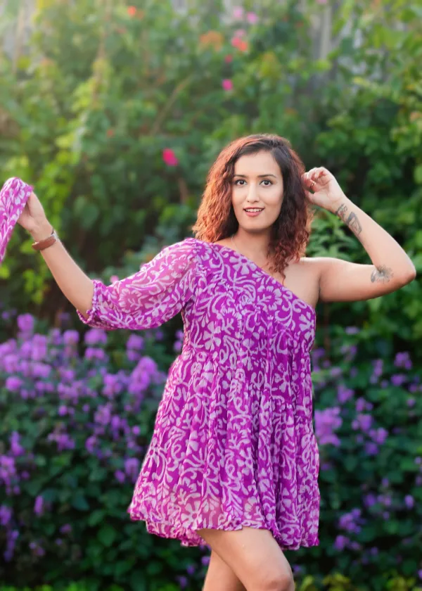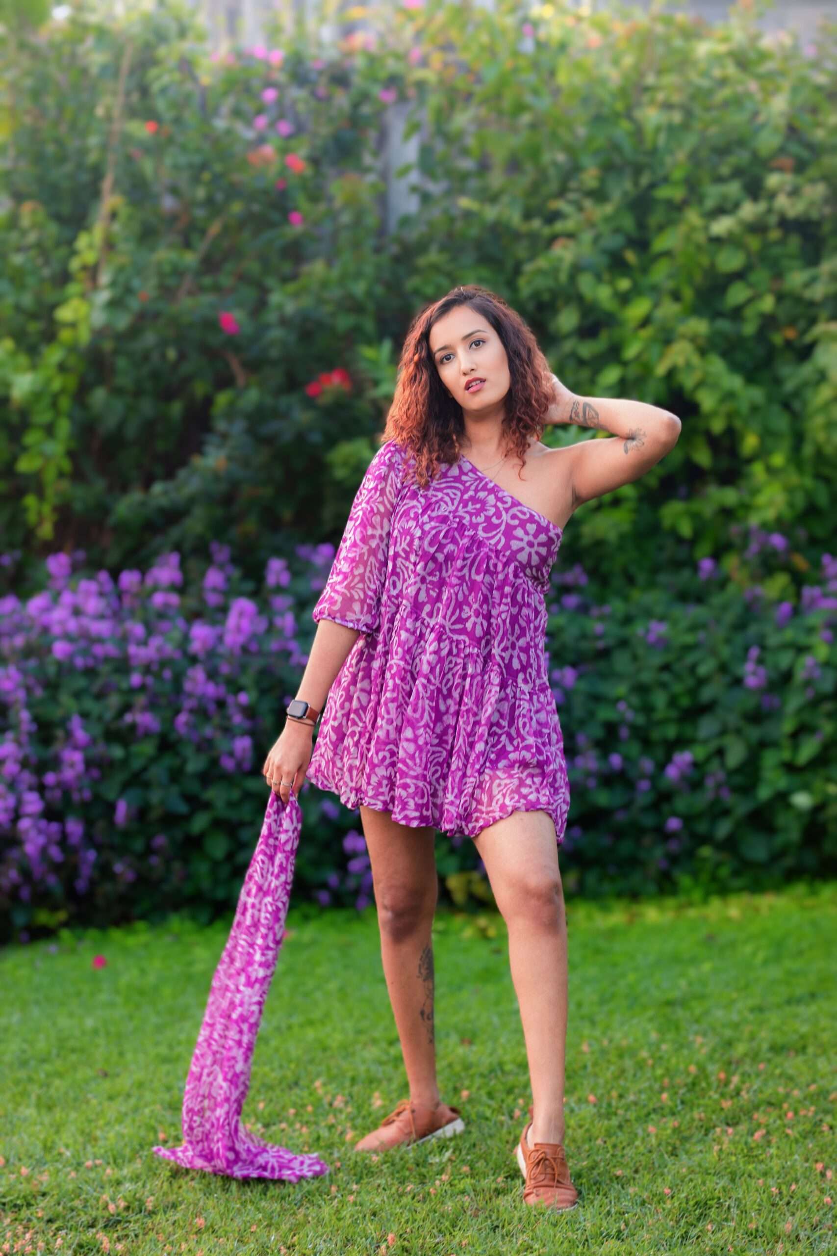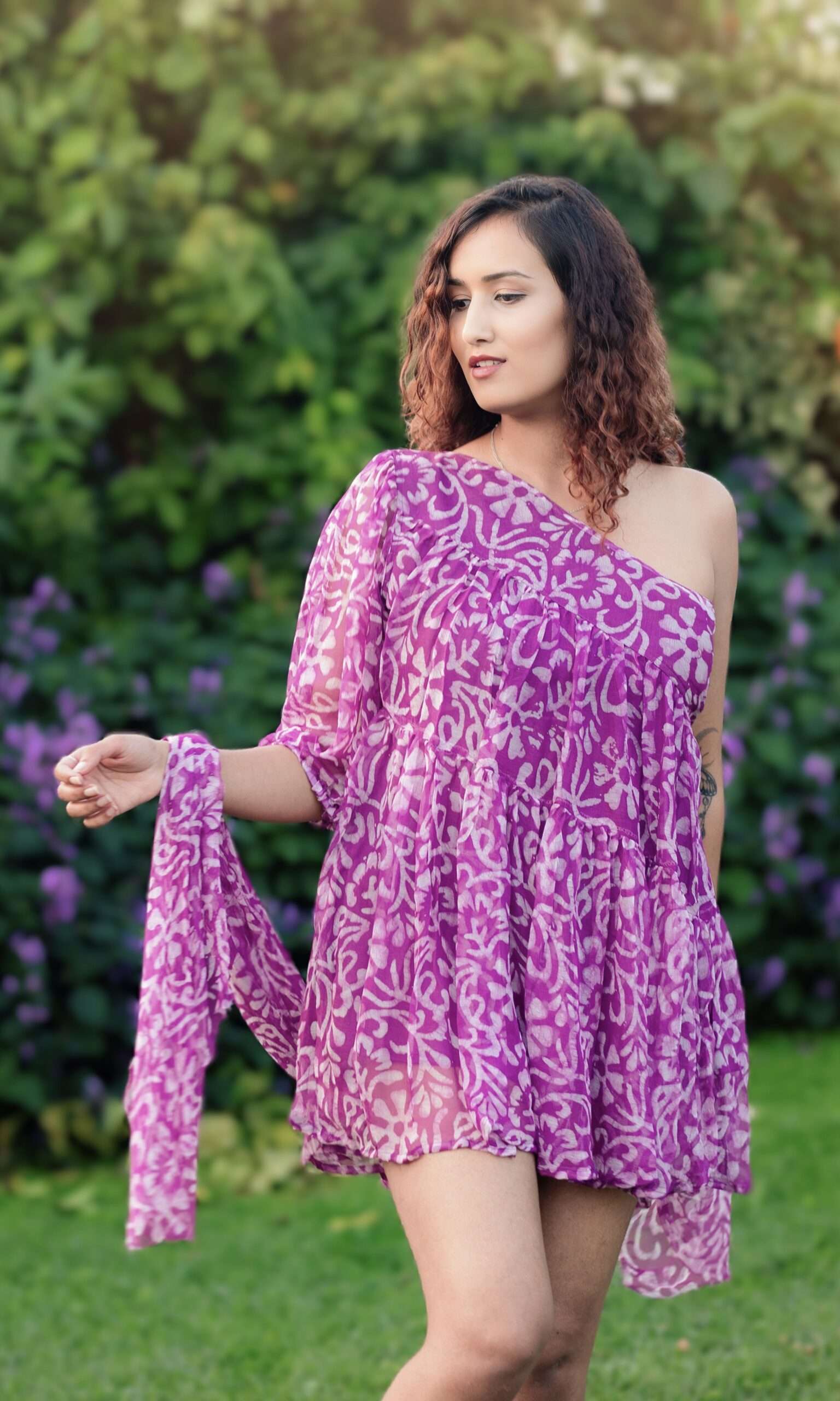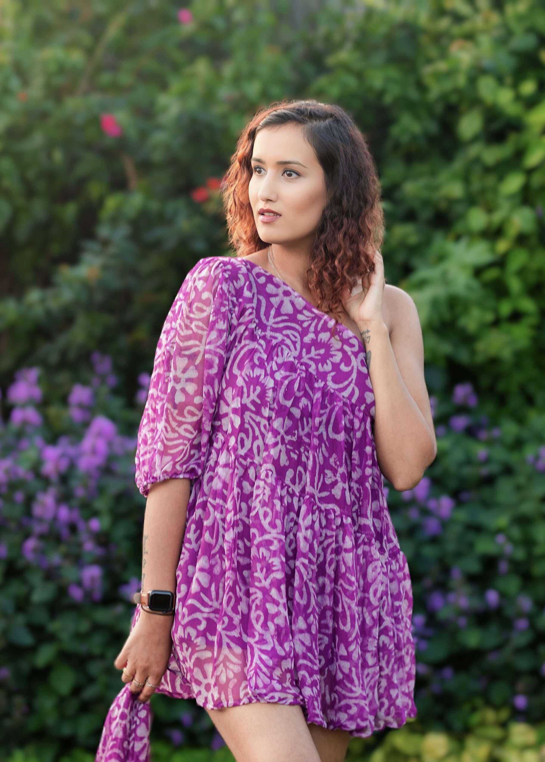 The Midsummer Bloom Mini Dress features a sheer one-shoulder sleeve, a side zipper for ease of wear, and a fully lined interior for added comfort and coverage. Each piece is hand-dyed, showcasing unique patterns and vibrant magenta hues. Comes with a matching scarf and scrunchie for coordinated styling.