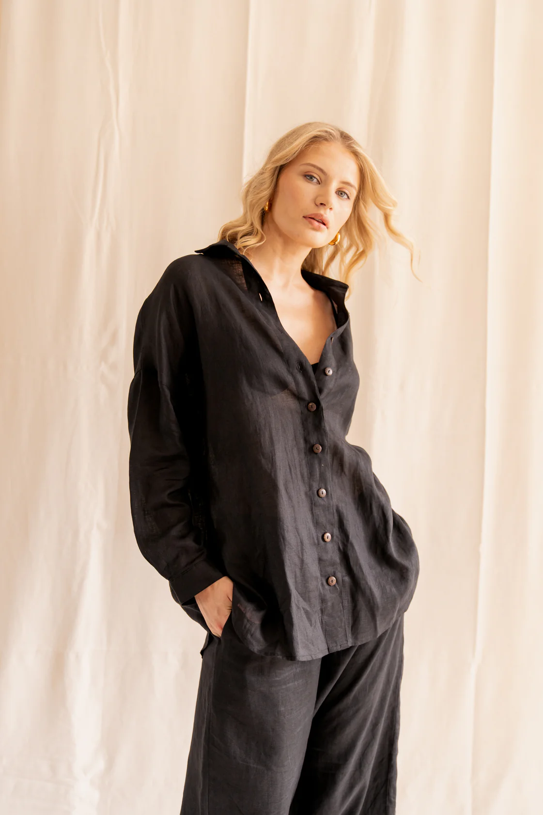 Discover the essence of lightweight sophistication with the Noa Long Sleeve Linen Button-Up. This versatile shirt features a refined collared V neckline and is designed with a relaxed oversized fit that elegantly drapes to the hips with an elongated hemline. Whether styled on its own or layered for a chic finish, the Noa shirt embodies a clean, timeless aesthetic, making it an indispensable piece for your capsule wardrobe.