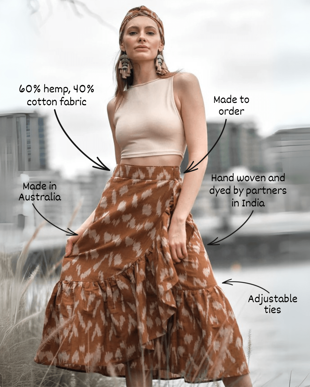 Our Parvi skirt is named after Parveen, an inspirational young lady from our partner charity, Sambhali Trust in India with an incredible story. The print is named after Amy, one of our wonderful machinists who lovingly makes our garments at our non-profit production partner, The Social Studio in Melbourne, Australia.