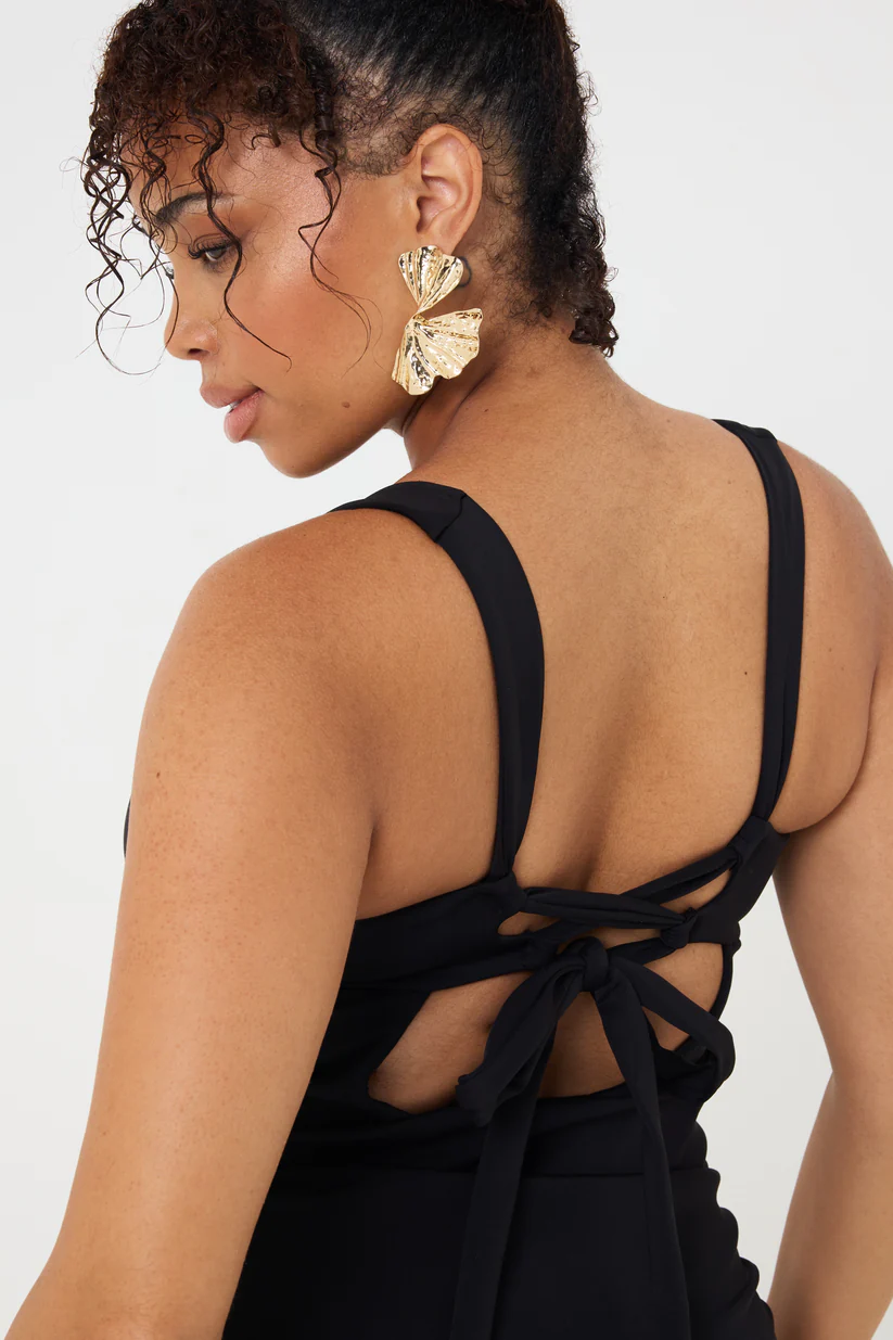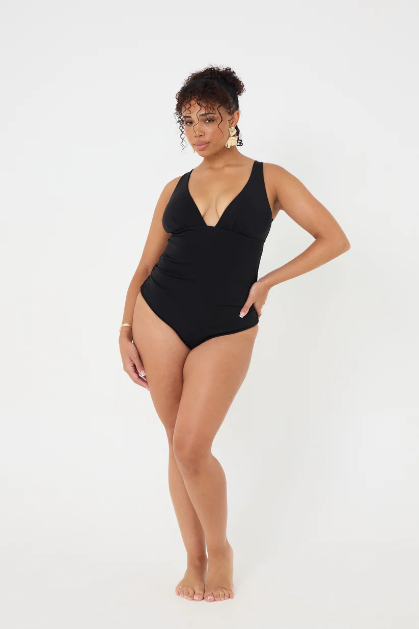 A plunging V neckline swimsuit where sexiness meets serious support. This swimsuit was designed with a fuller bust in mind, combining bold styling with thoughtful construction. Added fabric through each bust panel offers full, secure coverage for larger cup sizes. This plunging V neck will comfortably accommodate from a C-E /F cup depending on size. While a thick tie-back design, relieves pressure from the shoulders and provides adjustable lift and form fit from the back.Â