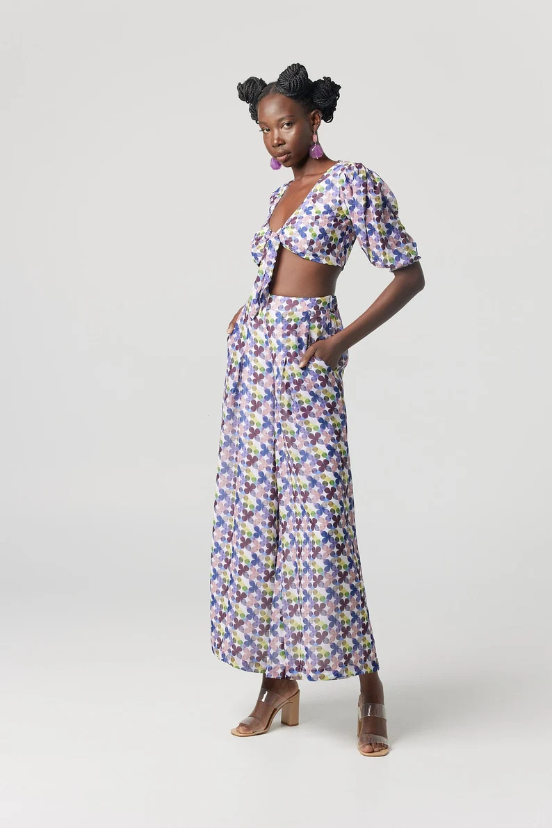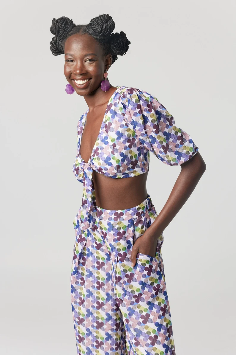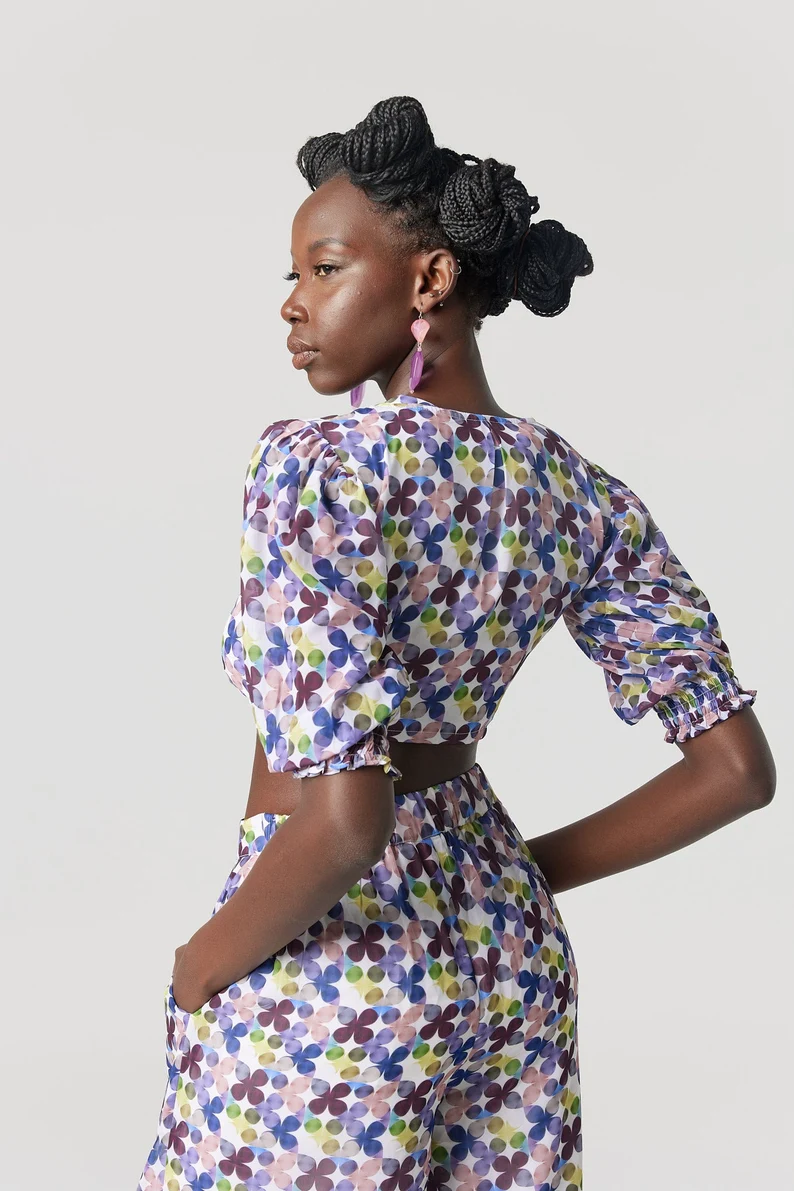 A stunning tie top with an original print designed in house exclusively for the Kaleidescope collection. Shop the matching pants.